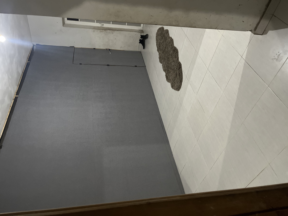 An interior view looking down into a room. The left side is dominated by a large, smooth gray surface, possibly a wall or floor. To the right, white tiles cover the floor. A shaggy brown rug is placed near the top right corner of the gray surface, next to a pair of black boots. A window is visible in the upper portion of the room.