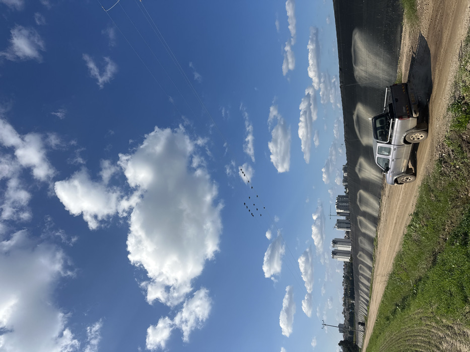 The image depicts a rural-urban interface in Beit Yitzhak-Sha'ar Hefer, Israel, under a bright, partly cloudy blue sky. A dirt road occupies the lower-middle portion of the frame, leading towards the background. To the left of the road is a strip of green cultivated field with visible plant rows. A silver double-cab pickup truck, possibly a Nissan model, is positioned on the dirt road, facing away from the viewer, with its rear visible. The truck appears to be parked or slowly moving, with visible dirt on its exterior. To the right of the road, a long, black agricultural netting or shading barrier runs parallel, displaying light grey patterns that suggest water spray or wear. In the midground, a cluster of modern multi-story residential buildings, some under construction with visible cranes, stands on the horizon. Above the horizon and to the left, a flock of approximately 15-20 dark birds is flying in a loose V-formation. High-tension power lines extend diagonally across the upper right quadrant of the sky. Numerous white cumulus clouds are scattered across the blue sky. No individuals are visible.