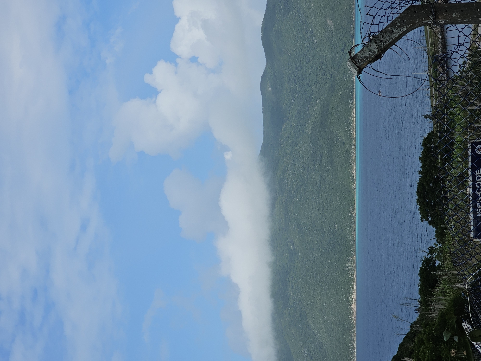 This image depicts a coastal landscape in Arraial do Cabo, Brazil. The scene is dominated by a light blue sky with scattered white cumulus clouds, with some larger formations present on the right. A large, verdant mountain range covered in dense green vegetation stretches across the background, with its peaks on the left partially obscured by a horizontal band of white fog or low-lying clouds. In the middle ground, a vast expanse of deep blue water, likely the ocean or a bay, is visible, featuring a distinct narrow strip of turquoise water where it meets the distant, vegetated shoreline. The foreground contains green foliage, including several cactus-like plants on the left. A dark-colored chain-link fence extends across the lower portion of the frame, partially obstructing the view. On the right side of the fence, a weathered, gray concrete post is visible, topped with rusted, tangled barbed wire. A dark blue sign with white lettering, partially obscured by the fence at the bottom center, displays the text "ISPS-CODE." A small, dark-hulled boat with a light-colored cabin is visible on the water in the middle distance, positioned to the left of the concrete fence post. No human figures are explicitly visible in the scene.