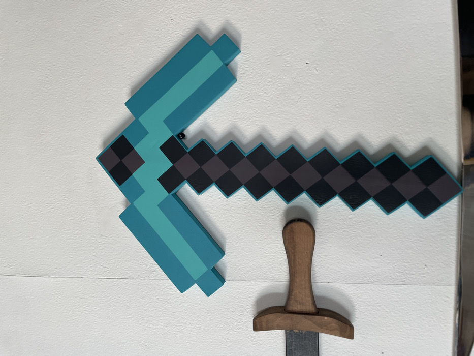 The image displays two pixelated, decorative objects mounted on a textured white wall. The primary object is a large, diamond-pickaxe-shaped item, characteristic of the video game Minecraft, oriented vertically with its pick-end facing upward and slightly to the left. The pickaxe features a teal blue "diamond" head composed of individual square pixels, and a dark grey and black checkered "stick" handle, also made of square pixels. A small, black screw or nail head is visible securing the pickaxe to the wall near the intersection of the head and handle. To the left and slightly below the pickaxe's handle, a portion of a second object, appearing to be a wooden sword handle, is visible. This handle is light brown with a carved, rounded grip and a flat guard. A dark grey blade section extends to the left from the handle, partially obscured by the frame. The wall itself appears to be a consistent white or off-white color with a slight texture. The overall environment suggests an indoor setting, likely a room or common area. The specific location in the city of Lyon, France, cannot be determined from the provided visual information.