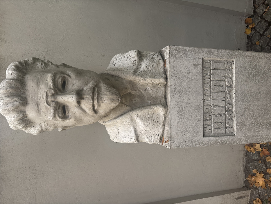 A light grey, textured stone bust of Władysław Stanisław Reymont is positioned against a plain, light grey stucco wall