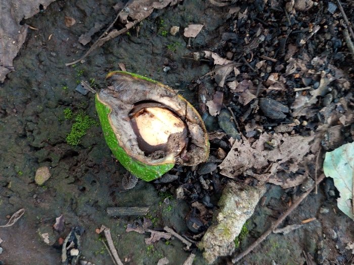 The scene is observed on the ground in Abbireddygudem, India. A single, partially decomposed fruit, approximately 8-10 cm long, rests centrally on dark, moist soil. The fruit has a textured, green outer skin, which is split open longitudinally, revealing a cream-colored, ovoid seed or nut, approximately 4-5 cm long, embedded within dark brown, decaying internal pulp. Surrounding the fruit, the ground is covered with scattered dry, brown leaves of various sizes, small twigs, dark granular organic debris, and patches of vibrant green moss. A lighter-colored, irregular piece of organic matter, possibly decaying wood, is visible in the lower right portion of the frame. The overall environment appears to be an outdoor setting with natural ground cover. No human subjects or discernible actions are present.