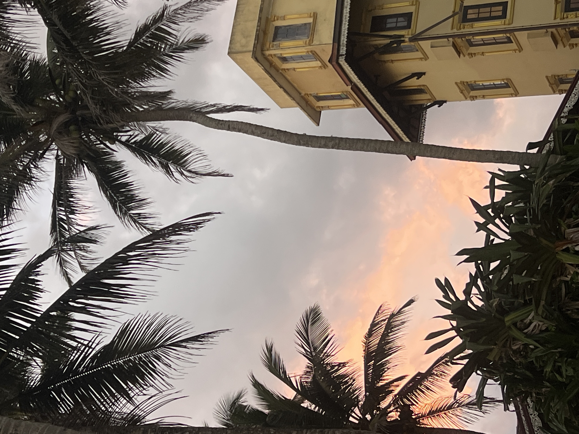 The scene is located in Kathaluwa, Sri Lanka, during twilight hours, displaying a sky of grey clouds streaked with orange and pink light. Multiple palm trees are prominent. One tall, slender palm trunk rises vertically on the right. Dense palm fronds are visible across the top and left, with a smaller palm tree on the left containing several green coconuts. Lush, green tropical foliage occupies the lower foreground. A multi-story building, appearing light yellow, stands on the right. It features multiple windows with dark frames and golden decorative surrounds. A dark brown roof eave with white, ornate gingerbread-style trim and dark support brackets is visible. No persons are depicted.