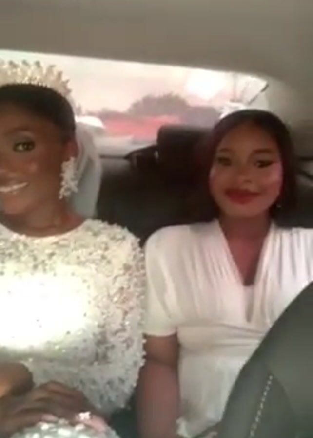 Two women are sitting in the back of a vehicle. The woman on the left is wearing a white, beaded, long-sleeved dress, a tiara, and a veil. She is smiling and has her hands clasped in her lap. She also appears to be wearing a ring. The woman on the right is wearing a white dress, has red lipstick on, and is holding what looks like a small black box. The interior of the vehicle is visible, with black seats and glimpses of the outside through the windows. The car seems to be moving.