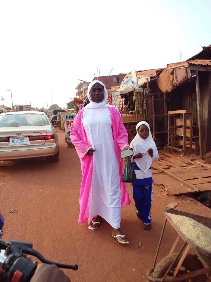 An overhead photograph captured from a low angle on a reddish-brown dirt road in Ankpa, Nigeria, depicts two females walking past market stalls. In the foreground, the handlebars and a hand of a motorcycle are visible on the lower left. An adult female, positioned slightly left of center, wears a white full-length dress, a bright pink open over-robe (abaya/jilbab), a white headscarf (hijab), and white flip-flops. She holds a dark-colored object, possibly a mobile phone, and a small black plastic bag in her left hand, which is positioned at her midsection. Her gaze is directed towards the camera. To her right, a young female child walks alongside, wearing a white long-sleeved top, blue trousers with white patterns, a white headscarf (hijab), and dark flip-flops. She holds a small white plastic bag in her hands. Her expression is neutral, and she looks forward. On the left side of the frame, a gold-beige Toyota Camry sedan with Nigerian license plate BDG-166CJ is either parked or moving slowly on the dirt road. The right side of the scene features a series of rustic market stalls or shops constructed from corrugated metal sheets, wood, and other makeshift materials. Some displays of goods are visible within these structures. A partially obscured sign on a light pole reads "EVANGEL" and "POPCORN" below it. In the lower right corner, a hand-pulled cart or wheelbarrow filled with light-colored grains (possibly rice or beans) is present. The background reveals additional buildings, some multi-story and constructed of brick, under a bright, clear sky. Overhead electrical wires are visible against the sky. The ground surface is predominantly reddish-brown dirt, with scattered debris, including wooden planks, near the market stalls.