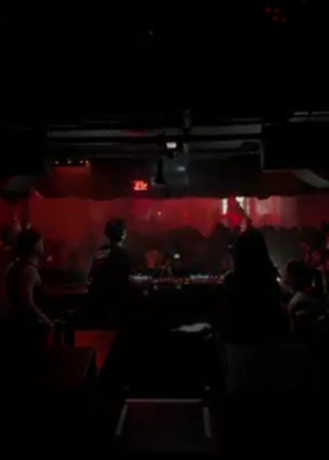The video captures a DJ performing in a dark nightclub. Red lighting permeates the crowded dance floor, filled with silhouettes of people dancing and moving. The DJ, wearing a black Vans t-shirt, stands behind a mixing console. Several people are seated at tables in the foreground, partially obscuring the view of the DJ and the crowd. The general atmosphere is lively and energetic, with music and dancing defining the scene.