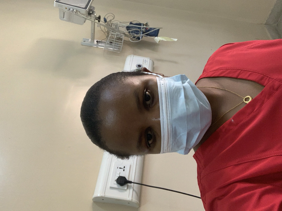 An adult female is depicted in a close-up, chest-up image within what appears to be a medical facility. She has dark skin and dark hair pulled back, with her eyes visible and directed towards the camera. She wears a light blue disposable surgical face mask covering her nose and mouth, and a red V-neck scrub top. A thin gold-colored chain with a small, circular gold-colored pendant hangs around her neck. The background consists of plain, light-colored walls. To the left, a white wall-mounted unit featuring two Type G (three-pin rectangular) electrical outlets is present, with a black power plug inserted into one. A toggle switch is also visible on this unit. To the right, an articulated metal arm extends from the wall, supporting a medical monitor (partially visible) and a white wire basket. Below this apparatus, medical tubing or cables are seen hanging, with another white wall-mounted component partially visible beneath the wire basket. The environment, characterized by medical equipment and Type G power outlets, is consistent with a healthcare setting in Tanzania. The specific location within Dar es Salaam is not discernible from the provided visual information.