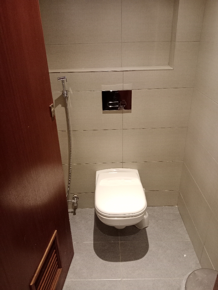 The image depicts a toilet in a small, tiled bathroom. The toilet is white and is mounted on the wall. There is a chrome-plated toilet flush valve on the wall behind the toilet. A chrome-plated shower head and hose are attached to the wall to the left of the toilet. The floor of the bathroom is tiled in a light gray color. The walls are tiled in a light beige color. The bathroom is located in Eldoret, Kenya, at the coordinates 0.52 latitude and 35.268 longitude. There are no people in the image.