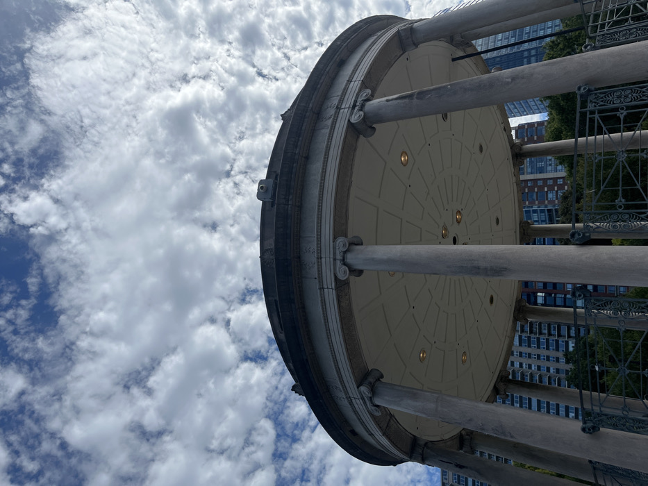 The image displays the Parkman Bandstand, located within Boston Common in Boston, Massachusetts, United States. The perspective is low-angle, looking upward at the circular, classical-style stone structure. The bandstand features several large, fluted columns with Ionic capitals, supporting a robust entablature and a flat, circular roof. The underside of the roof, serving as the ceiling, is white with an intricate radial and geometric patterned design, containing multiple recessed circular light fixtures. The entablature above the columns is adorned with decorative carvings. A dark, ornate metal railing with scrollwork and finials is visible at the base of the structure. Above the bandstand, the sky is visible, exhibiting a clear blue background with numerous scattered white cumulus clouds. In the background, beyond the bandstand's columns and railings, several tall, multi-story urban buildings with numerous windows and balconies are visible. Green foliage from trees partially obscures these distant structures. No individuals are present in the frame.