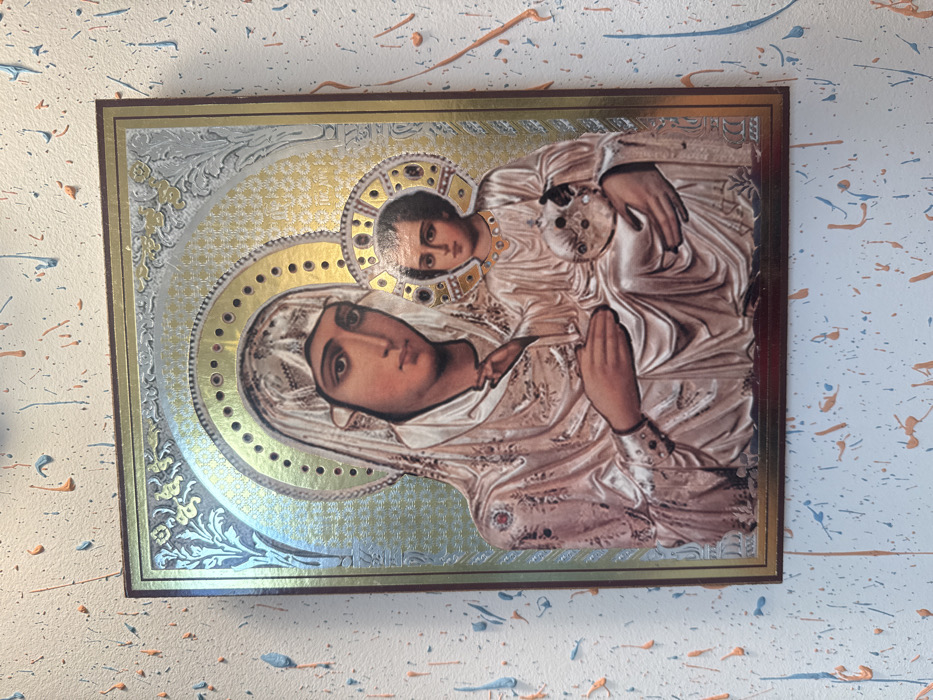 - "A rectangular, framed religious icon depicting the Virgin Mary holding the Christ Child is centrally positioned on a white wall in Vidin, Bulgaria" by FM-C2nvH3, licensed under CC BY 4.0