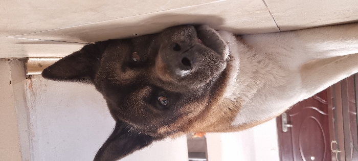 - "A large domestic dog, exhibiting a dark brown head, ears, and back, transitioning to white fur on its chest, belly, and legs, is lying on its left side on a tiled floor" by FM-l4hwp2, licensed under CC BY 4.0