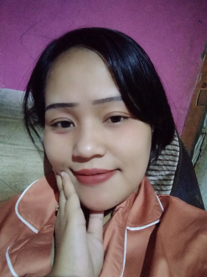 In the city of Unknown, Unknown, a close-up, head-and-shoulders image depicts an individual indoors. The subject is an adult female with dark, straight hair, a light brown complexion, dark eyes with eyeliner, and defined eyebrows. She has a subtle, closed-mouth smile, with her lips colored a matte reddish-brown. Her left hand, adorned with a ring on the ring finger, is positioned against her chin and lower jawline. She wears a rust-colored collared shirt with white piping detail. The background, out of focus, includes a solid magenta wall section behind her head, a light brown upholstered surface behind her left shoulder, and a darker, striped or textured fabric behind her right shoulder. The subject is looking directly at the camera.