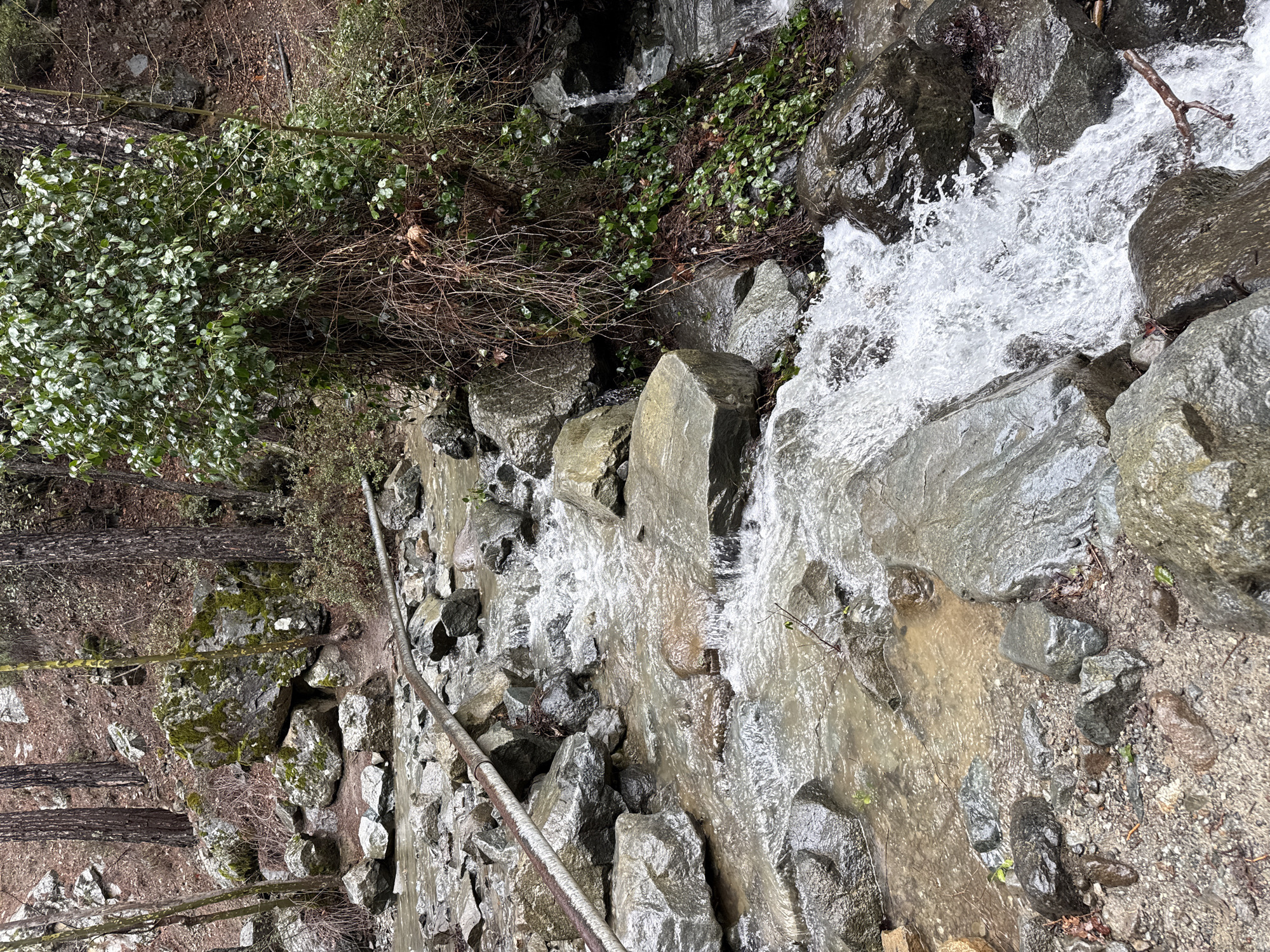 rocky stream in a wooded area, likely in Pano Platres, Cyprus. Water cascades over and around large, gray rocks. Vegetation including green bushes and bare branches lines the stream. A metal pipe runs parallel to the stream on the left. The surrounding environment appears to be a forest floor with fallen leaves and trees.