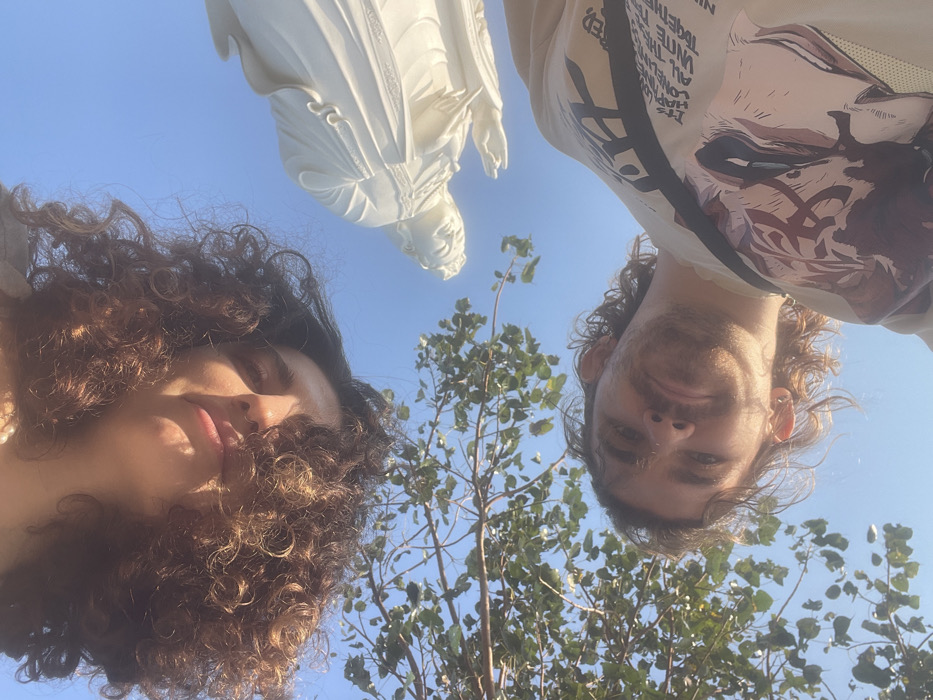 A low-angle, upward-facing photograph depicts two individuals and a large white statue under a clear blue sky in Sơn Trà Ward, Vietnam. In the upper-center, an individual with curly brown hair is seen from an inverted perspective, with eyes open and mouth slightly parted, looking downwards towards the camera. In the lower-center, a second individual, appearing male, with medium-length wavy brown hair and light facial stubble, looks directly at the camera. He wears a light-colored t-shirt featuring a graphic print of a stylized face and text. To the right of the frame, behind the individuals, stands a tall, white statue of a robed figure, consistent with the Guanyin statue at Linh Ung Pagoda. Green tree foliage occupies the left side of the frame. The scene is illuminated by bright natural daylight.