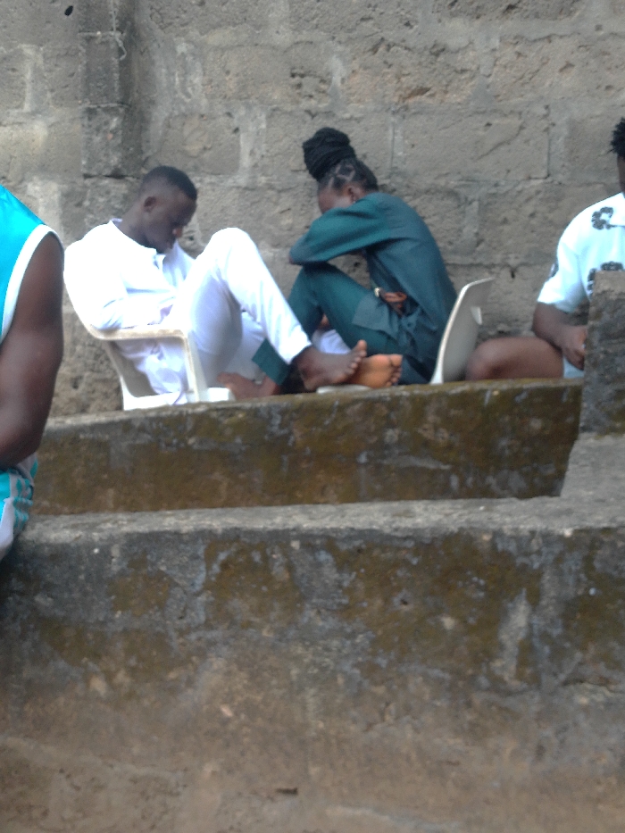 Three people sit on a concrete structure. A man in white leans forward in his chair, focusing downward. A woman with dreadlocks rests her arms on her knees, her face hidden. Another man, wearing a floral-patterned top, sits to the right. The setting is a rough, perhaps outdoor location with a textured, stone-like wall behind them. The seating structure appears to be tiered. Only part of the fourth person with a blue top is visible in the frame, obscuring part of the left side of the picture.