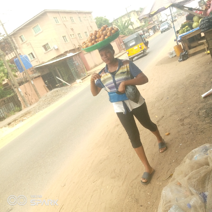 A young adult female stands on the dry, light-brown dirt shoulder of a paved road in Onitsha, Nigeria