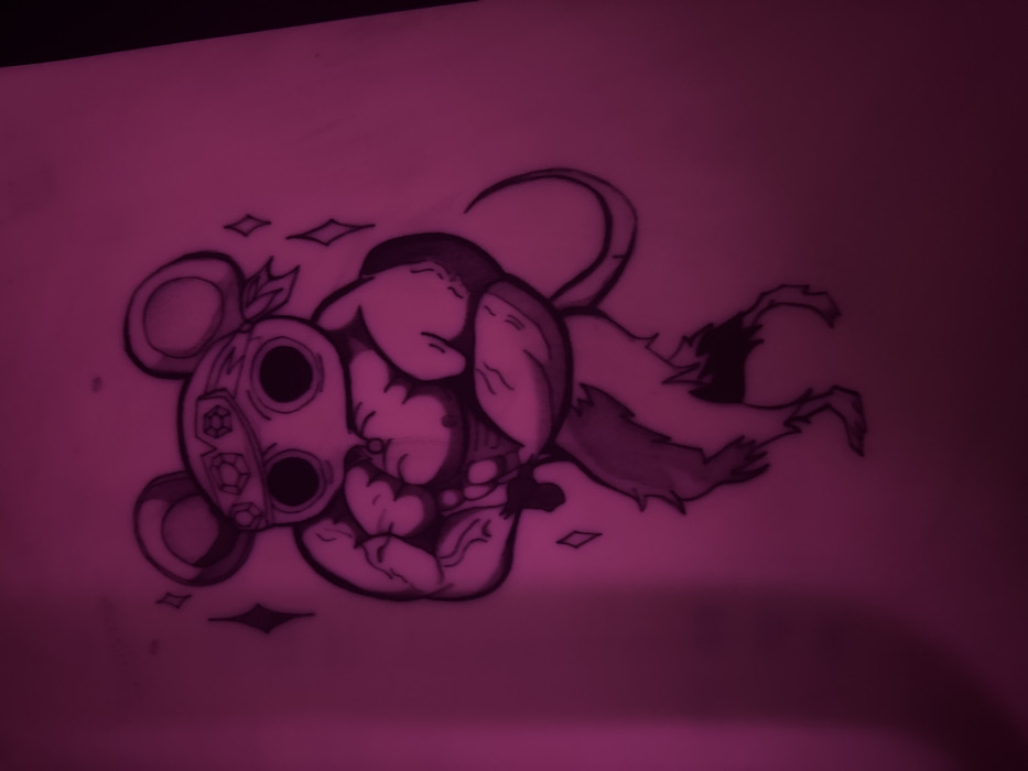 An image, potentially depicting a tattoo or artwork, is presented against a uniform magenta background under dim, pink-hued lighting