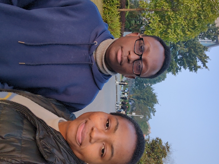 This image depicts two individuals, a male and a female, positioned in the foreground of an outdoor environment in Jiangjin, China. The male, situated on the left, presents with dark skin, short dark hair, and black-framed glasses. He wears a dark blue hooded sweatshirt over a light grey ribbed turtleneck sweater and maintains a neutral expression while looking directly at the camera. The female, positioned to the right and slightly behind the male, also has dark skin and short dark hair. She wears a black puffer jacket over a light-colored top with horizontal stripes and exhibits a slight smirk with her tongue faintly visible between her lips. The background reveals a paved pathway lined with lush green trees and shrubs. Several indistinct individuals are visible walking or standing on this pathway further back, suggesting a public space. In the far background, through the foliage, a modern building with light-colored architecture is partially discernible. The sky above is a clear, light blue-grey, and the scene is uniformly lit without harsh shadows.