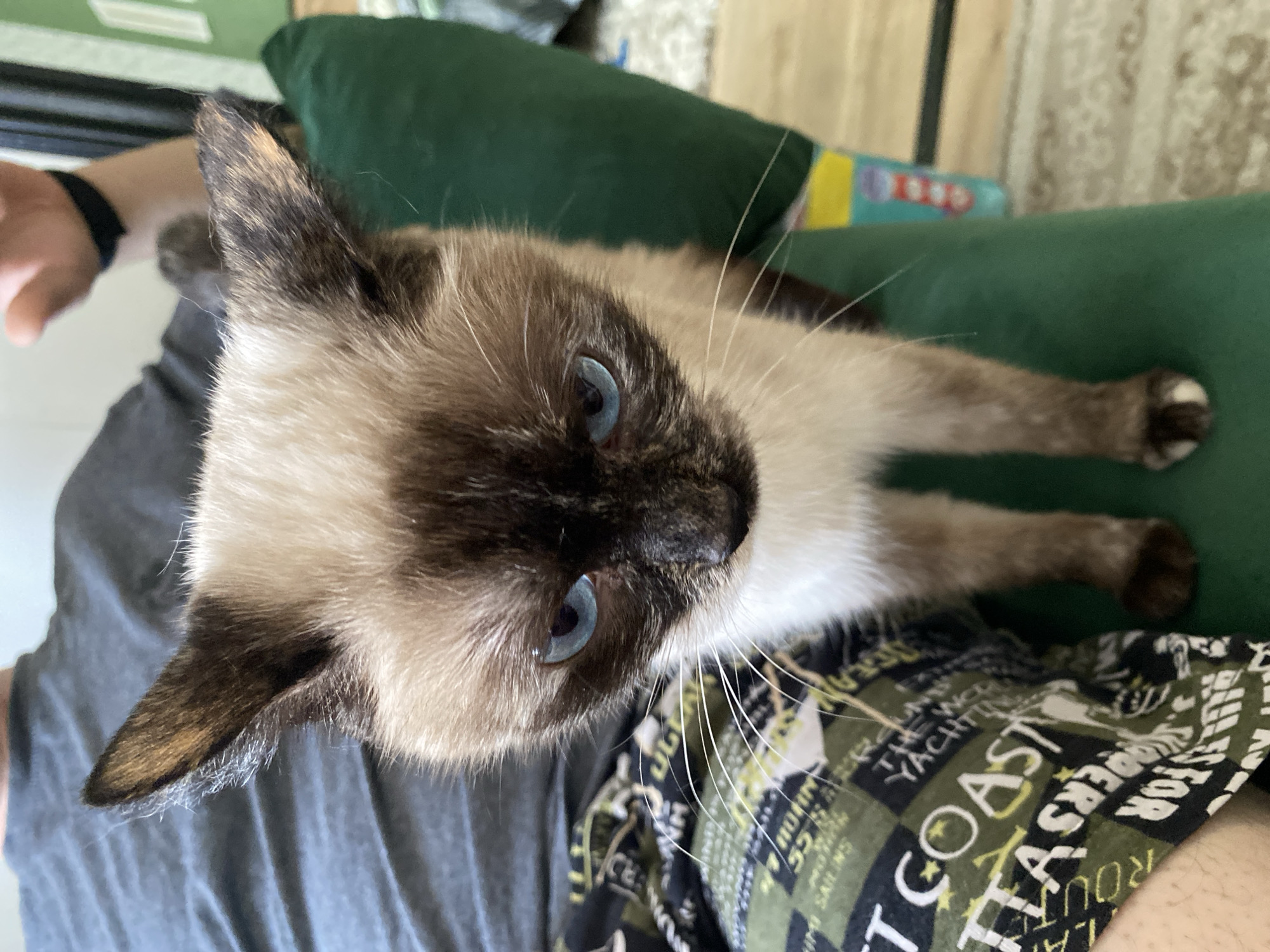 A Siamese cat with striking blue eyes is the primary subject of the image, seen from a high-angle perspective. The cat is positioned on a person's lap, with the person wearing a gray t-shirt and a patterned shirt with the words "COAST" and "YACHT" visible. The cat's body stretches across the person's lap, with its paws visible. The background includes a green cushion. The image provides no visual clues or information to indicate that the photograph was taken in the city of Chaikovsky, Russia.