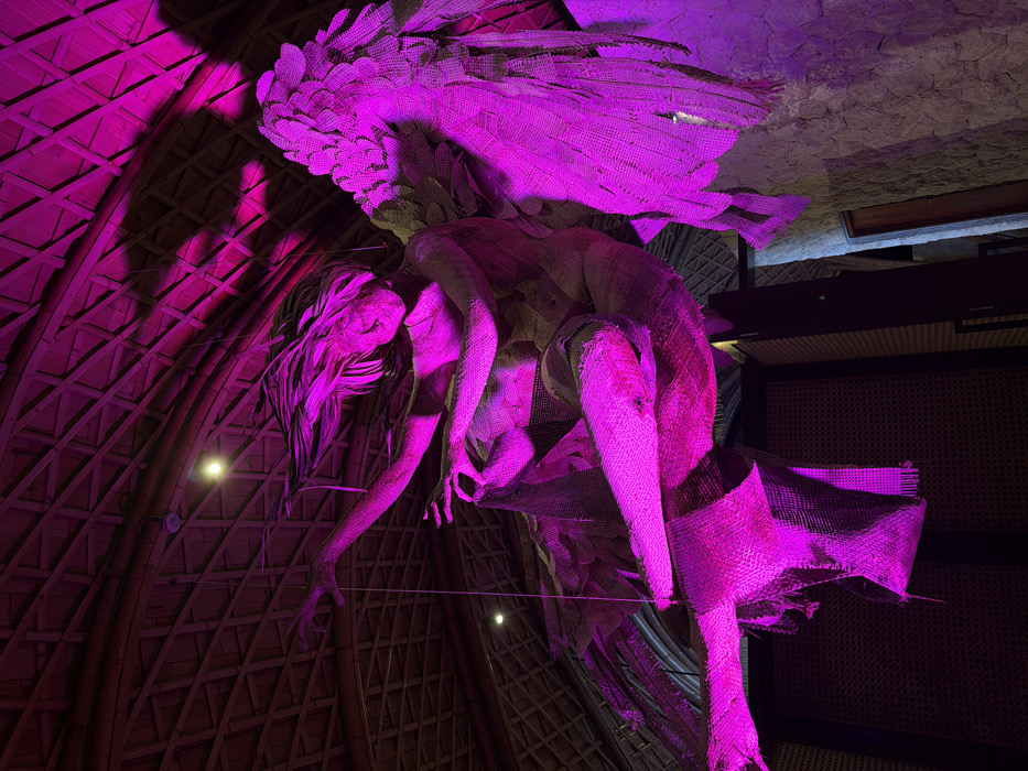 A large, intricately crafted sculpture of a winged humanoid figure, likely female, is suspended within an interior space in Ungasan, Indonesia