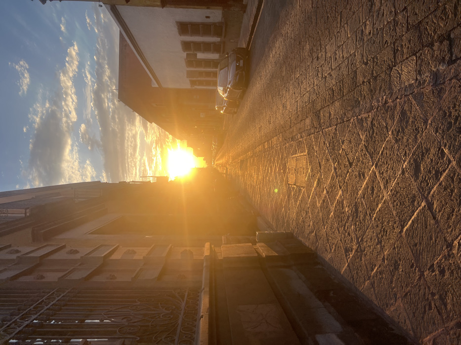 A street basks in the golden light of the setting sun