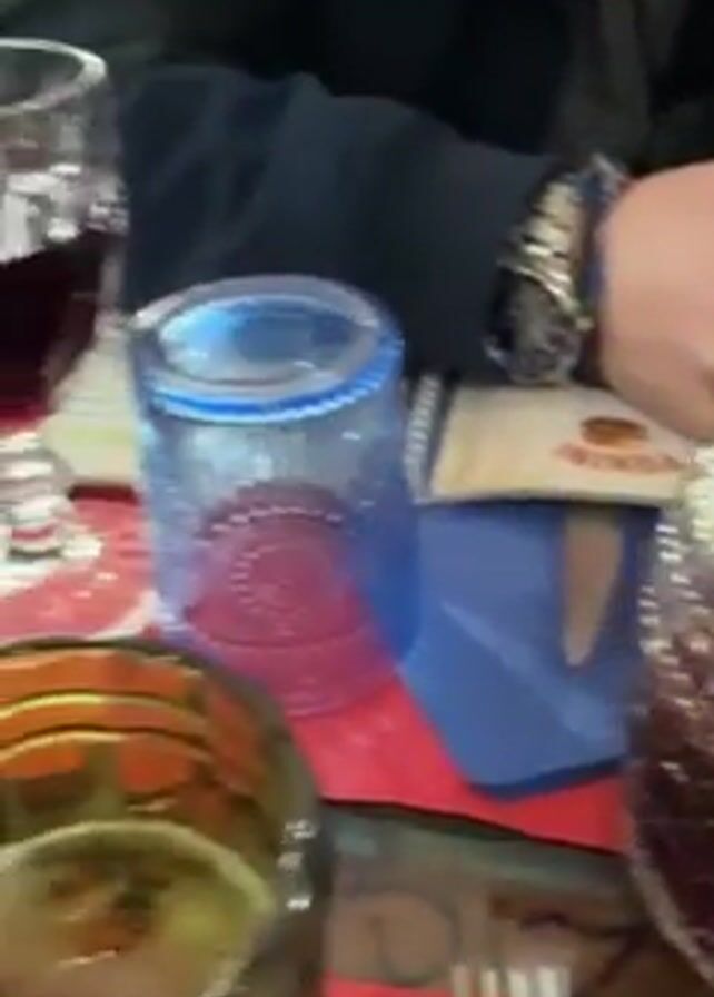 table setting in a restaurant, with a focus on beverages. There is a decorated carafe of red liquid, a wine glass filled with red wine, and a bottle of green beer on the table. A blue glass and silverware are also present. The table has a red placemat and a patterned napkin. The video then pans to show the interior of the restaurant. There is a wooden structure with glass panels that displays a QR code for the menu. The restaurant is decorated in a rustic style with wooden furniture and tiled floors. In the initial frame a person’s wrist with a watch and beaded bracelet is visible. Another person is also seen sitting at the table.