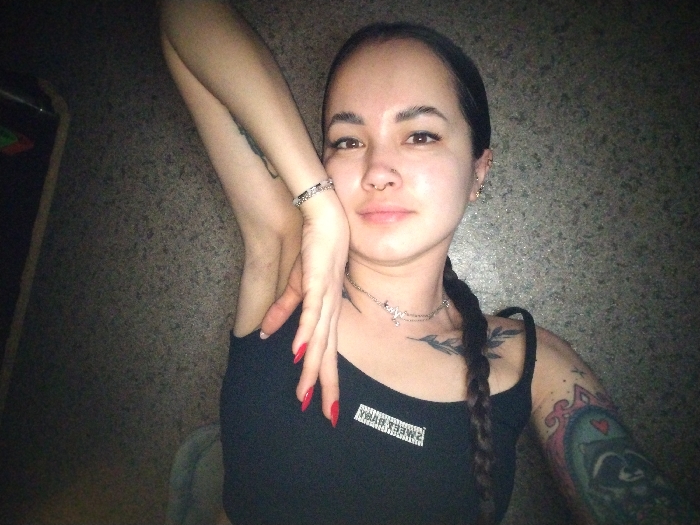 A young woman is posing for a selfie. She has a nose piercing and multiple earrings. Her hair is dark, long, and braided on one side. She wears a black tank top with a rectangular white label. Her nails are painted red. She has several tattoos, including one on her arm depicting a raccoon framed in a heart-shaped mirror, and another on her chest resembling leafy branches. She is fair-skinned, has a silver bracelet, and a silver necklace with a cross pendant. Her hand is near her face. The background appears to be a speckled wall and a partially visible piece of furniture.