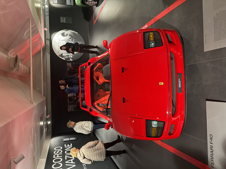 The image displays an indoor exhibition at the Ferrari Museum in Maranello, Italy