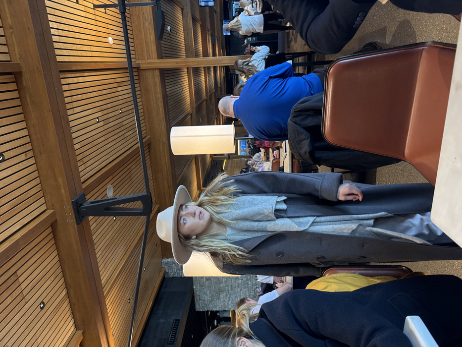 Inside a restaurant, a woman with blonde hair and a beige hat is wearing a gray coat and scarf