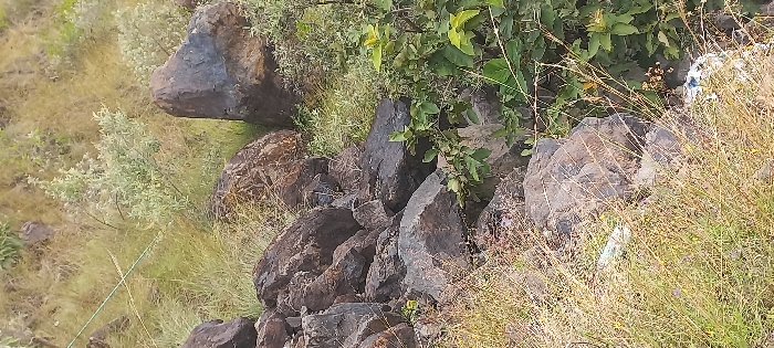 The image depicts a rocky, vegetated hillside in Kabarnet, Kenya. Numerous dark, irregularly shaped rocks, ranging in size, are scattered and piled across the midground and foreground, suggesting a natural rock formation or recent rockfall. The terrain is covered by a mix of dry, yellowish-brown grasses and various green shrubs. In the midground, a shrub with dark green foliage bears several small, light green, spherical fruits or buds. Another lighter green, bush-like plant is visible in the upper midground. A thin, light-colored line, possibly a wire or rope, extends diagonally from the upper-left towards the center-left. Near the bottom right, partially obscured by grass and rocks, pieces of white and blue plastic debris are present. No individuals or animals are visible, and no discernible actions or interactions are occurring within the static scene.
