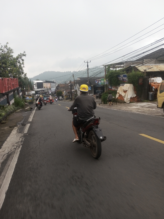 The image depicts a street scene in the city of Tangsibi, Bhutan, on an overcast day. A single individual, viewed from behind, is riding a dark-colored motorcycle down an asphalt road. The rider wears a dark gray long-sleeved shirt, dark shorts, white socks, white slip-on shoes, and a yellow baseball cap worn backwards. The motorcycle, dark red or maroon, has no visible passenger. The road features a yellow solid line marking a lane or center and a white solid line on the left defining a shoulder or edge. Ahead, several other motorcycles and a small vehicle are observed moving in the same direction. On the left, a red and white/blue painted wall is followed by dense foliage and multi-story buildings. On the right, older structures line the road, one partially covered with white tarp. Utility poles with numerous overhead power lines are present on the right. A person walks on the right sidewalk near the covered building, and a light-colored utility truck is partially visible on the far right. Distant hills are visible under a gray, cloudy sky.