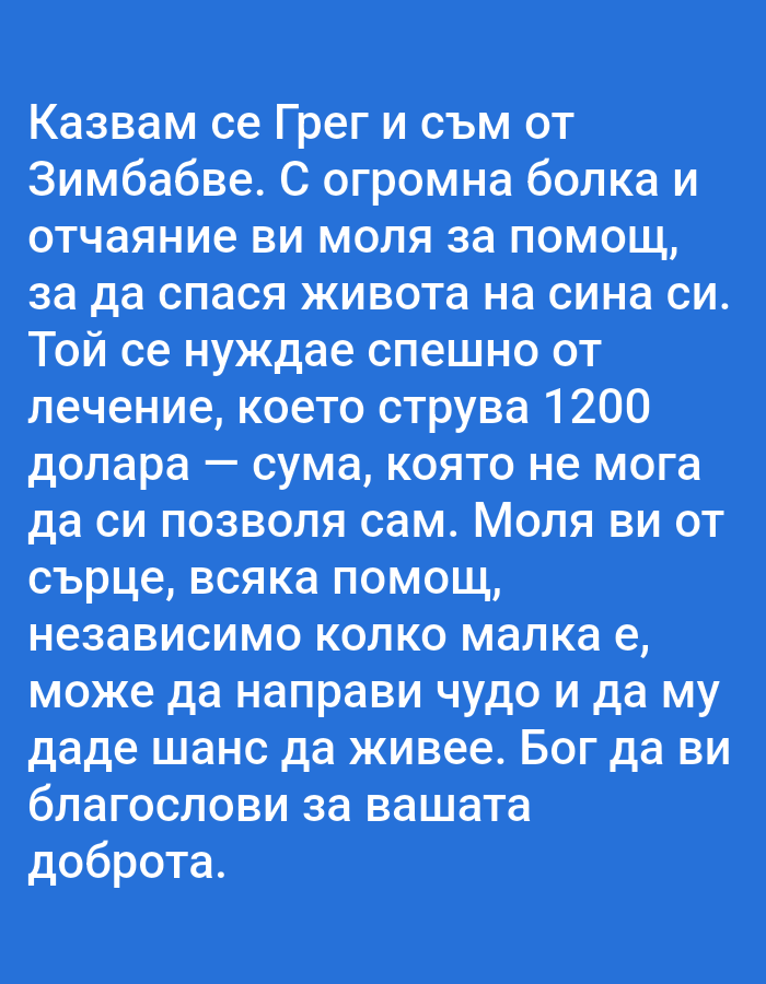 The image displays white Bulgarian text on a solid blue background. The text, translated, presents a plea from an individual named Greg, identifying himself as being from Zimbabwe, specifically within the city of Kwekwe as per the provided context. Greg states he is in immense pain and despair, requesting assistance to save his son's life. His son requires urgent medical treatment, estimated to cost 1200 US dollars, a sum Greg claims he cannot afford independently. He appeals for any amount of help, asserting that even small contributions could be miraculous and provide his son a chance to live. The message concludes with a blessing for the kindness of potential helpers.