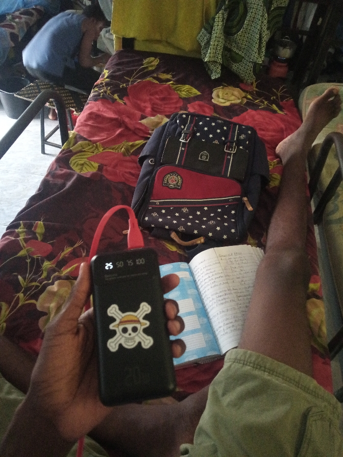 The image depicts an indoor scene in Hayin Banki, Nigeria, with a dark-skinned individual in the foreground holding a black power bank. The power bank displays "25" percent charge and features a "One Piece" Jolly Roger sticker; a red charging cable is plugged into its top. The individual's right leg, clad in khaki-colored shorts, is extended towards the right side of the frame. An open notebook with handwritten text rests near the power bank and leg. On a bed with a maroon and red floral pattern, a dark blue backpack with a red front pocket and white star pattern is placed. In the background, a second individual is visible, wearing a light blue top and seated or kneeling on a black stool. The floor appears to be a light-colored tile or concrete. Various fabrics, including a yellow and a green patterned cloth, are visible in the far background.