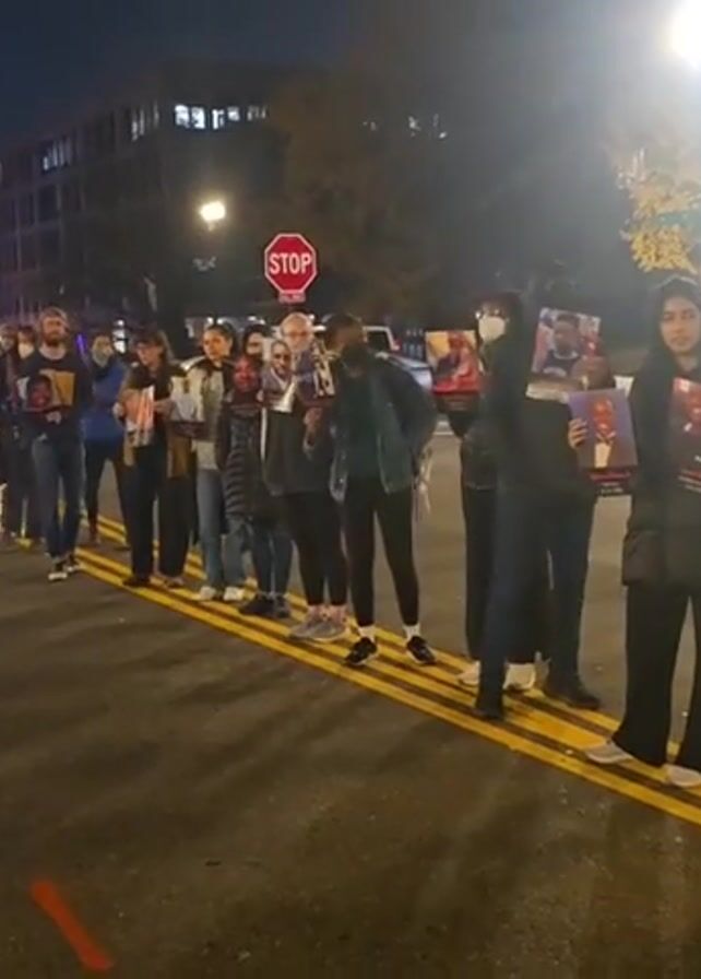 line of people protesting at night. They are standing on the side of a street, separated from traffic by yellow lines. Most of them are holding up signs with a picture of a Black man on them. One person is holding a sign that says "Stop Termination." There is a stop sign visible on the other side of the street. There are police cars present with their lights on.