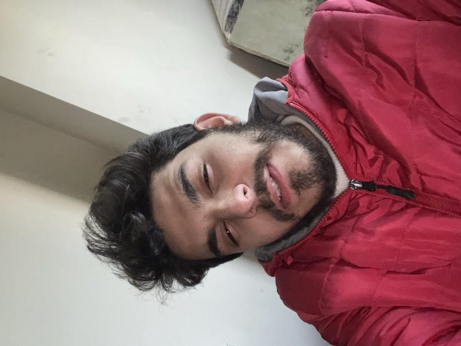 An individual is depicted in an indoor setting within Rukn ad-Din Municipality, Syria. The subject is a male, appearing to be in his late teens or early twenties, with dark, wavy hair, a dark beard, and a mustache. He is wearing a red puffer jacket over a cream or off-white high-necked garment, with a gray hooded layer visible beneath the jacket. His eyes are partially closed, and his mouth is slightly open, revealing his upper teeth and the tip of his tongue, conveying a dazed or sleepy expression. The background consists of a plain, light-colored wall with faint smudges or discoloration. To the right of the subject, a portion of an indistinct object, possibly a framed item or furniture with a light, textured surface, is visible. The lighting is ambient, illuminating the scene from the front.