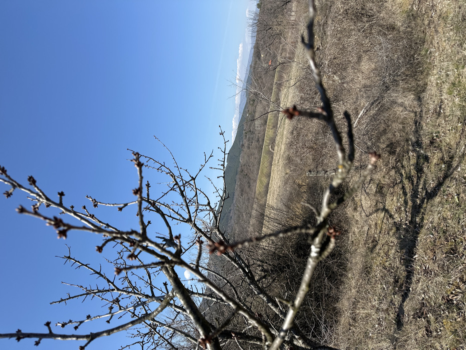 The image captures an outdoor, rural landscape in Granitsa, Bulgaria, under a clear, bright blue sky. The foreground features a dense, out-of-focus network of bare tree branches with visible reddish-brown buds, indicating early spring. These branches cast distinct shadows onto the dry, yellowish-brown grass and sparse, leafless shrubbery covering the undulating terrain. A faint wire fence post is discernible in the lower-right midground. In the mid-distance, a broad, lighter brown field curves across the landscape, bordered by hills covered in varying densities of dark brown and green vegetation. A tall, slender structure, resembling a communication tower, stands on a distant hill against the horizon. Farther in the background, additional hills and mountains show faint white patches, potentially snow or distant clouds. No individuals, animals, or discernible actions are present in the scene.