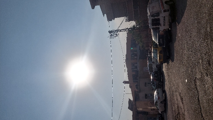 The image portrays a sunlit urban environment within Barza Municipality, Syria. The bright sun is centrally positioned in the upper portion of the frame, causing prominent glare and lens flare against a clear, light blue sky. The foreground consists of an uneven, unpaved or heavily cracked asphalt surface mixed with dirt and gravel. In the midground, several vehicles are parked. These include a white sedan with multi-spoke wheels, a dark-colored sedan, a yellow sedan (possibly a taxi), and a white Nissan utility van or pickup truck with "NISSAN" visible on its rear. No individuals are present or engaged in any discernible actions or interactions. The background features multiple multi-story buildings with flat roofs, some appearing worn. A central building exhibits a distinct chimney-like structure, and others display rooftop solar panels. A utility pole with numerous overhead power lines and insulators is visible on the right side, with cables traversing the upper midground.