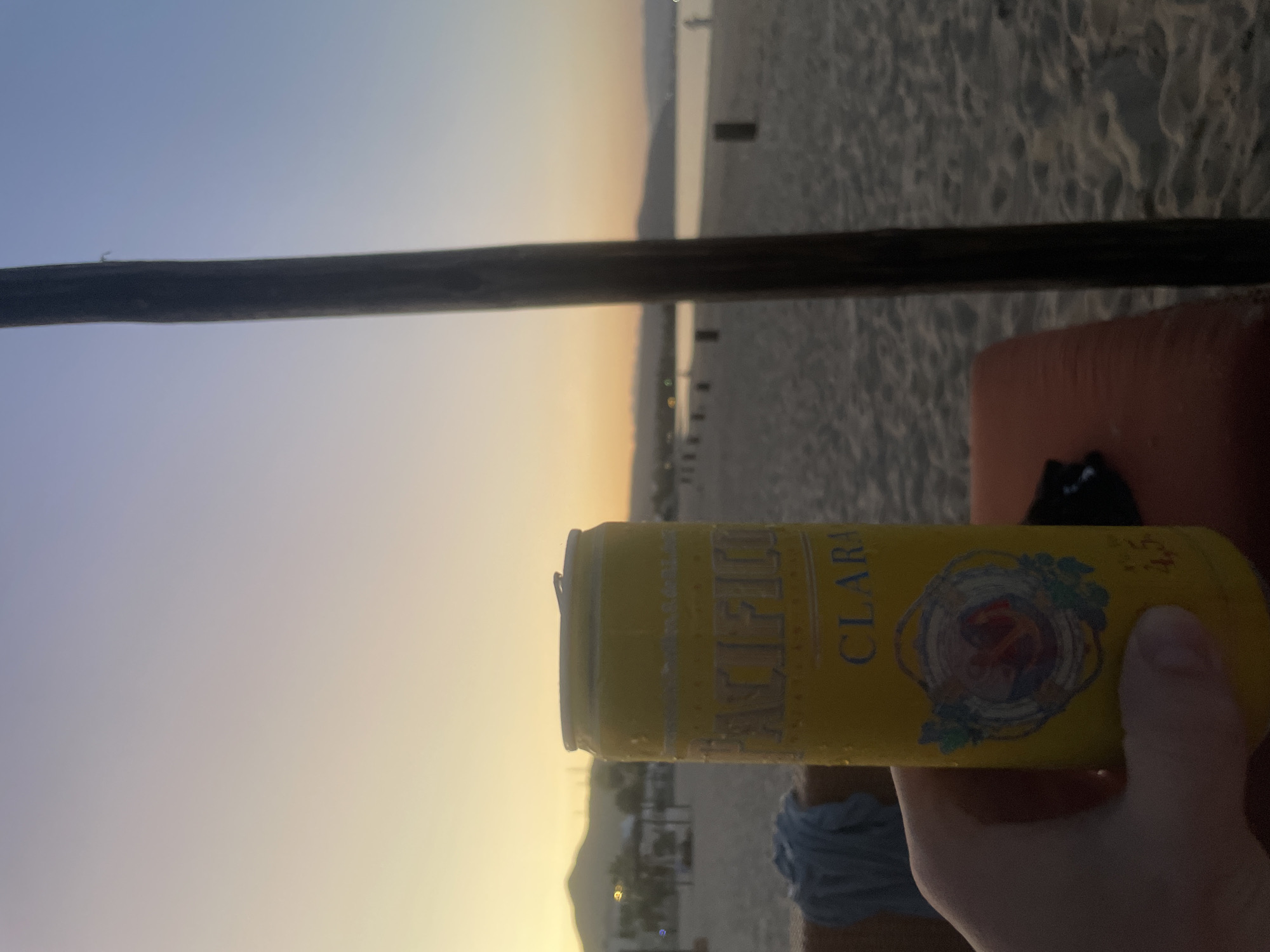The image depicts a beach scene, likely at sunset or sunrise given the yellow and orange hues in the sky. A can of Pacifico Clara beer is held in someone's hand in the foreground. The beach extends into the background, with visible sand and faint outlines of distant structures or possibly mountains. A wooden beam or pole stretches across the top of the image, obscuring a portion of the sky and background. A red cushion is also partially visible. The location is likely Buenavista, Mexico, based on the beer brand, as Pacifico is a popular Mexican beer. The scene suggests a relaxed atmosphere, likely on a beachside setting in the city.