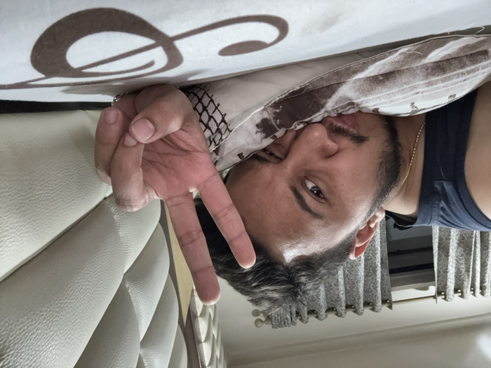A man is lying down, possibly in bed, with his head near the edge of the mattress. He is holding up his hand in a peace sign gesture towards the camera. He has dark hair and a beard, and is wearing a blue tank top. Curtains can be seen in the background. The bed has a patterned pillow and a quilted headboard.