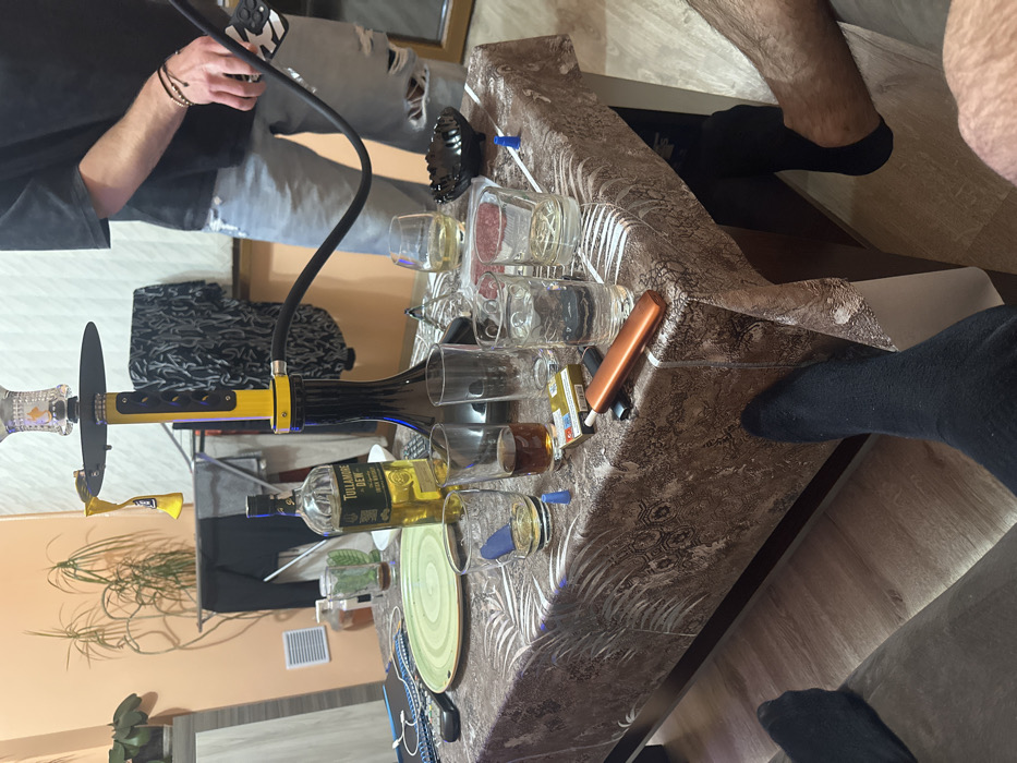 The image depicts an indoor social gathering, likely within a private residence in Sliven, Bulgaria. The central focus is a low table covered with a brown and white patterned tablecloth. On the table, a yellow and black hookah pipe stands prominently, with its black hose extending towards the right side of the frame. A small yellow wrapper hangs from the hookah. Beside it, a bottle of "Tullamore D.E.W. Irish Whiskey" is visible. Numerous drinking glasses are scattered across the table; several contain amber liquids (likely whiskey), one holds clear water, and others are empty or contain small residues. A light green circular plate with a spiral design, a dark remote control, a packet of cigarettes, an orange/copper-colored vape device, and a black rectangular object (possibly a lighter or another vape accessory) are also present. A small black textured bowl sits on the right side of the table, near a white plastic bag appearing to contain food items. In the background, an individual's upper torso, arms, and legs are visible on the right. This person wears a black t-shirt, light blue distressed jeans, and has dark bracelets on their right wrist while holding the hookah hose. Further back, an orange-painted wall features a white rectangular vent and a clothes drying rack draped with dark garments, including trousers and a patterned shirt. A tall, leafy houseplant stands on a shelf against the wall. The floor appears to be a light-colored wood laminate. In the foreground, two pairs of feet, belonging to at least two other individuals, are visible, suggesting they are seated. One pair wears black socks and extends from the left, while another pair, also wearing dark socks, appears from the right, with one leg notably hairy.