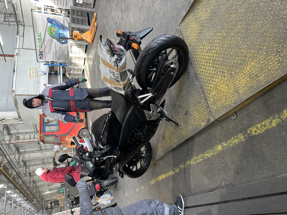 The image displays an indoor industrial or warehouse environment located in Солонцы, Russia. A black Honda CBR series sport motorcycle occupies the center, resting on its kickstand on a yellow diamond plate metal platform scale. The motorcycle's rear section, including the passenger seat and tail light assembly, is wrapped in clear plastic film secured with tan tape. To the right of the motorcycle, a man stands wearing a dark blue, grey, and red hooded winter jacket, brown pants, and green gloves. He is looking towards the motorcycle or a person partially visible in the foreground on the left. This individual's lower body is visible, clad in grey pants with reflective stripes and black Adidas sneakers, with their left arm extended towards the main motorcycle. In the background to the left, another person in a red winter jacket and white hat interacts with a second, smaller black motorcycle. A faded red industrial forklift is visible behind them. To the right in the background, a large banner displaying "ПЭК GLOBAL" and "МЕЖДУНАРОДНЫЕ ПЕРЕВОЗКИ" (International Transportation) is mounted, alongside stacks of grey plastic crates and an orange manual pallet jack. The floor is grey concrete, marked with a faded yellow line. Overhead industrial lighting illuminates the scene.