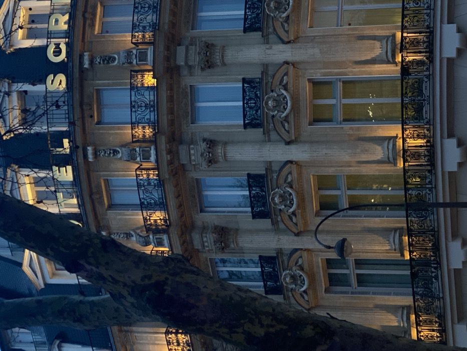 A Parisian-style building facade with ornate detailing. Balconies with intricate ironwork adjoin windows. Architectural pillars and decorative carvings accent the building. Sunlight streams through some of the windows, creating golden tones. A tree branch obscures the bottom portion of the image. The illuminated "LE SCRI" signage is visible at the top left.