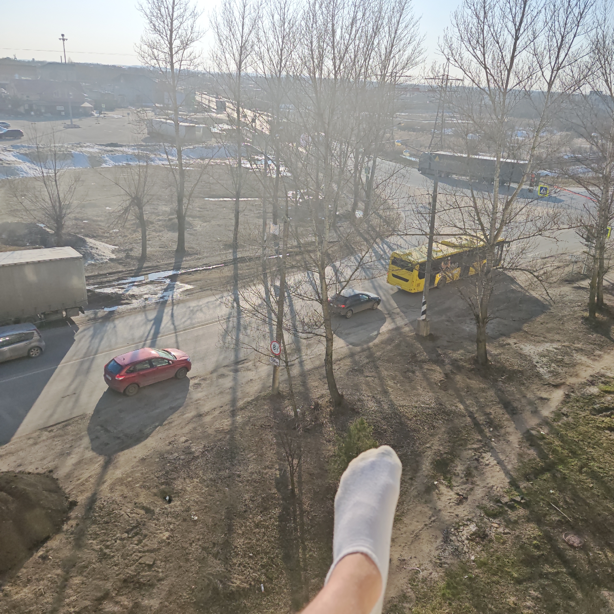The image presents an elevated, outward-looking view of a city street and its immediate environment in Rostov Veliky, Russia. The scene is illuminated by clear, bright daylight, casting long shadows suggestive of late winter or early spring due to the bare deciduous trees and remnants of snow. In the bottom right foreground, a human foot, encased in a white sock, is extended outwards from the frame's lower edge, indicating the viewpoint is from a raised position such as a balcony or window. The midground features an asphalt road system. A multi-lane road extends horizontally across the central part of the frame. On the left side of this road, a grey semi-trailer truck is either stationary or moving slowly. To its right, a red hatchback car is in motion. Further right, a dark-colored sedan car is partially obscured by the roadside trees. A yellow public transport bus, displaying graphics on its side, is located on the right side of the road, appearing to be in motion or recently stopped. Roadside infrastructure includes an "8t" (8-ton) weight limit sign with "300m" displayed beneath it, and a pedestrian crossing sign, both mounted on poles. A black and white striped pole stands near the yellow bus. The ground immediately surrounding the road is unpaved, characterized by dry earth, patches of sparse, dry grass, and areas of melting snow and mud, particularly on the left. Numerous bare-branched deciduous trees are scattered throughout the scene, casting prominent long shadows across the ground. The background depicts a hazy urban or industrial landscape. Buildings, including some industrial or commercial structures, are visible towards the horizon. A tall utility pole, topped with a siren or communication equipment, is prominent on the left side of the background. Behind the main road and trees, what appear to be railway tracks are discernible. The overall scene conveys an active, semi-industrial urban periphery.