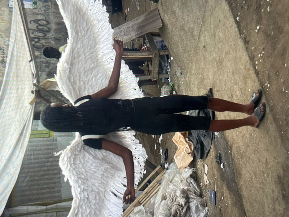 The image depicts a person with dark skin and long dark braids, appearing female, standing in profile facing right, wearing large white feathered angel wings. She is dressed in a short-sleeved black top, black capri-length leggings, and dark slides/sandals. Her arms are slightly extended, holding the wings open. The background consists of a cluttered, makeshift environment. Visible elements include structures constructed from corrugated metal sheets, wooden planks, and white tarpaulins, suggesting an informal settlement or heavily degraded urban area. A second individual, also with dark skin and wearing a light-colored top, is partially visible behind the central figure to the right. The ground is a mix of dirt and uneven concrete, heavily strewn with refuse, including plastic bags, fabric scraps, and various debris. Faint, illegible numbers and text are visible on the background surfaces. Visual evidence, specifically the architecture of makeshift structures, the extensive ground litter, and the format of phone numbers (e.g., "0704-64435," "09080," "02014516") visible on a background wall/tarp, does not align with typical urban environments or phone numbering systems in Paris, France. The environment strongly suggests a different, likely sub-Saharan African, location.