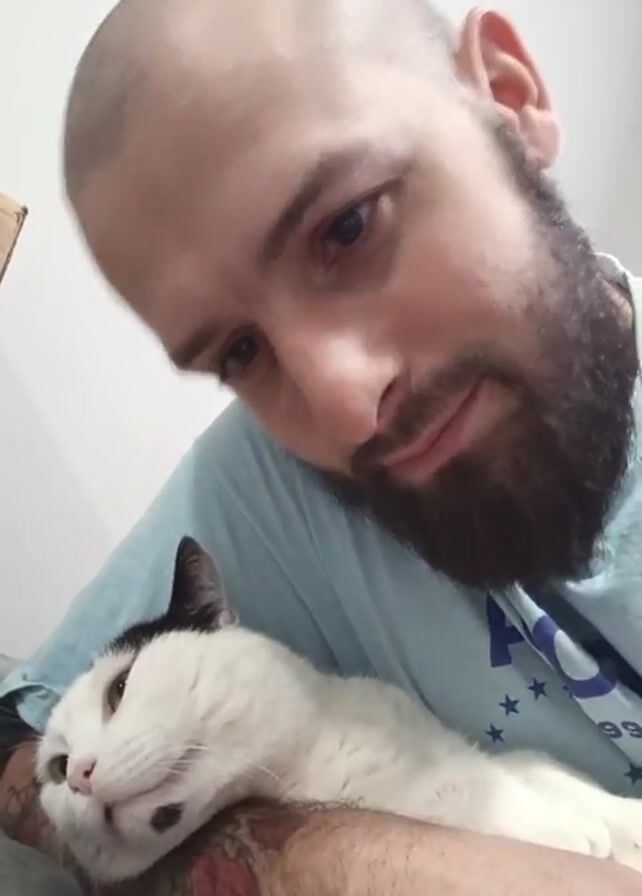 - "A fair-skinned man with a shaved head and beard is holding a white cat with black markings" by FM-1l0qu1, licensed under CC BY 4.0