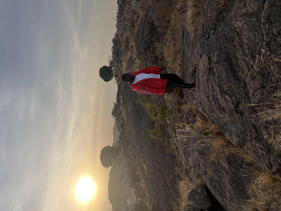 A person stands on a rocky cliff at sunset. The individual wears a red jacket over a white shirt and black pants. The sun shines brightly in the background, casting a warm glow over the scene. Sparse vegetation covers the rocks, and trees dot the landscape. The sky is a gradient of pale blue and orange, indicative of dusk or dawn. The image is rotated to the left.