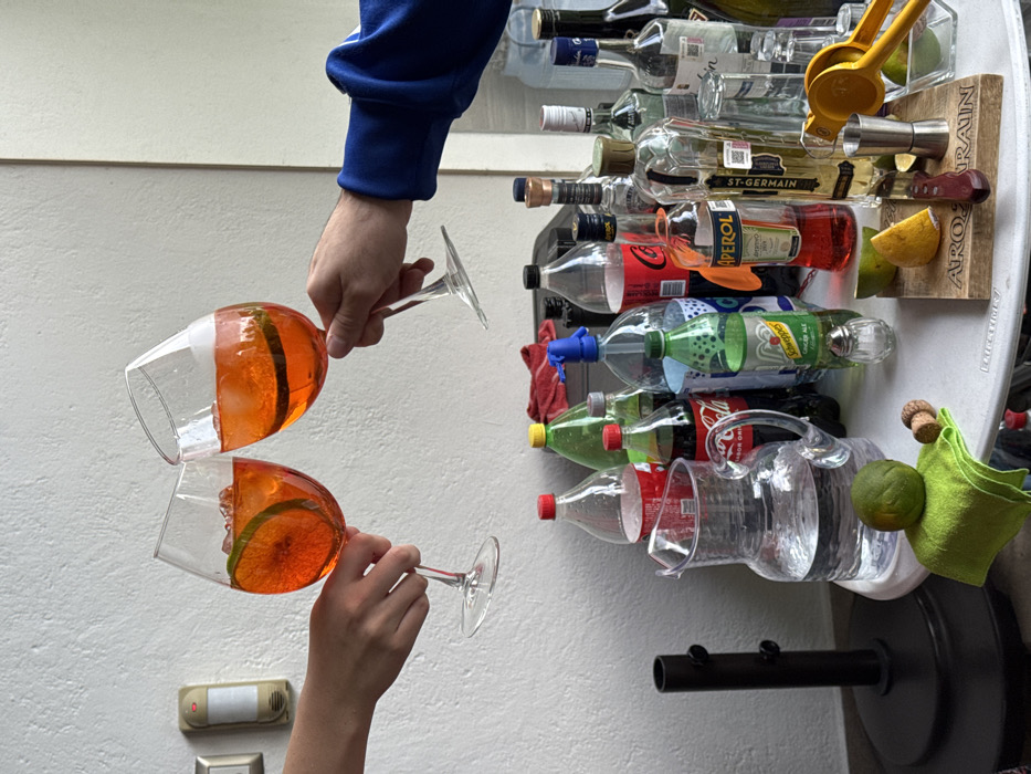 Two hands hold stemmed wine glasses filled with orange liquid and a slice of fruit, possibly lime. Behind them, a makeshift bar is mounted on a white wall. It features numerous bottles, including liquor bottles like St. Germain and Aperol, as well as soda and water bottles. A yellow lemon squeezer and a knife are attached. Other items include a lime, a cork, and a pitcher of water. The overall impression is a cheerful and somewhat unconventional setup for enjoying drinks.