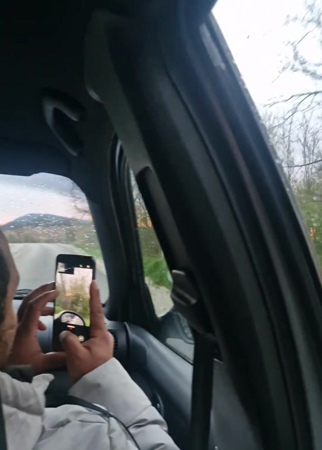 man in the back seat of a car using a mobile phone. He appears to be taking a picture of the sunset visible through the car window. The car is driving on a road next to a field. The window is wet with rain.