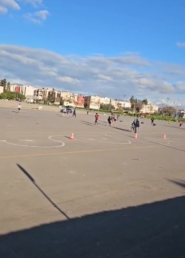sunny outdoor scene where people, primarily children, are playing in a large parking lot or open paved area. There are several individuals dispersed throughout the space, some appearing to play soccer, near orange traffic cones and painted white lines that form a snaking path. Some people are on bicycles. Buildings are visible in the background, suggesting this is within or near a town or city. The sky is blue with scattered clouds. In the foreground, there is visible trash and a shadow, indicating that the camera is filming the scene from slightly higher ground, possibly from the shade of an adjacent building. A motorcycle passes by quickly in the foreground.