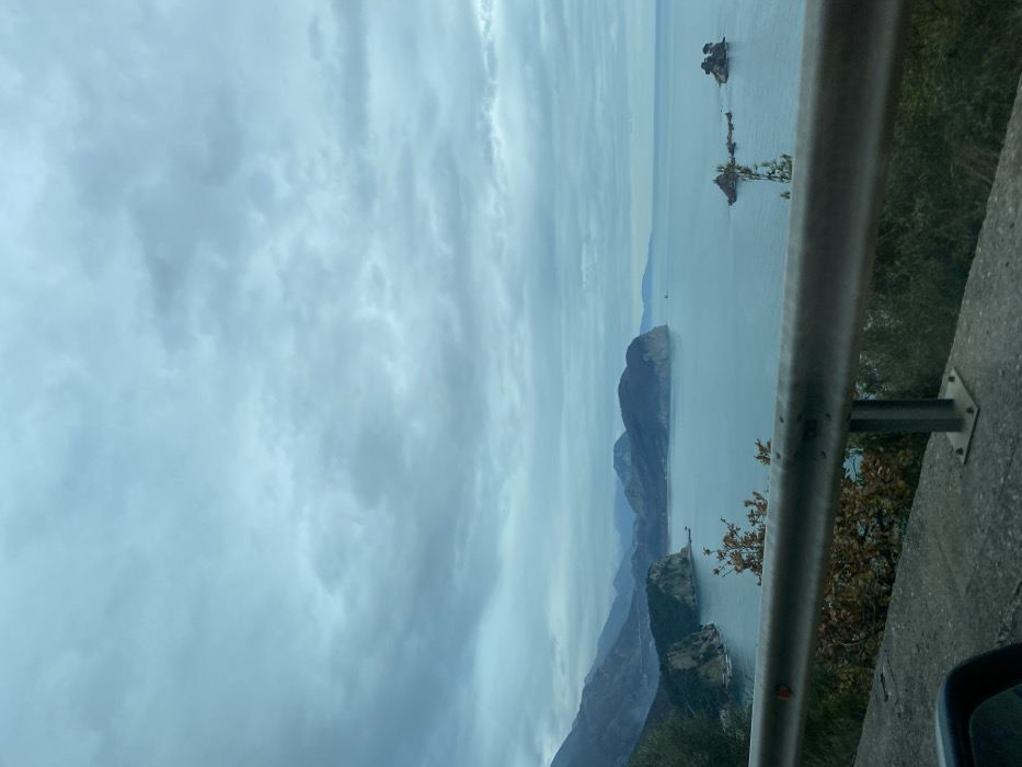 The image displays an overcast coastal landscape, identified as the Mirište area in Montenegro. The perspective is from an elevated roadside viewpoint, indicated by a grey metal guardrail running horizontally across the lower quarter of the frame. This guardrail is secured by vertical posts anchored into a dark grey concrete or paved surface. Immediately behind and below the guardrail, sparse vegetation with brown and dark green foliage is visible. The middle ground consists of a calm, muted blue-grey body of water, the Adriatic Sea, which extends to meet a uniformly overcast light grey sky at the horizon. Along the left side of the frame, a rugged coastline features multiple green, vegetated peninsulas and steep cliffs. Further inland, a series of larger, hazy blue-grey mountains recede into the distance. In the mid-right section of the sea, two small, rocky islets are present. The more prominent islet exhibits a small, light-colored structure, possibly a navigation aid, and sparse vegetation, including a few small trees. A smaller, bare rock formation is situated immediately to its right. No individuals or discernible actions are present. A dark, reflective surface, indicative of a vehicle's side mirror or interior, is partially visible in the bottom-left corner.